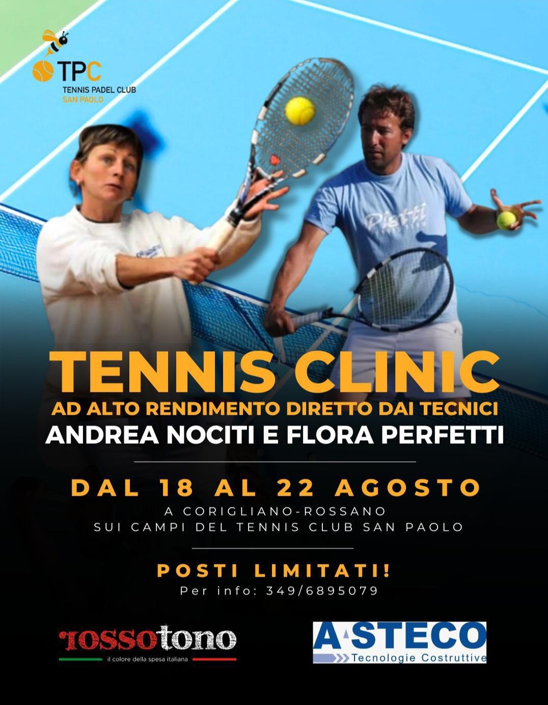 Scheda evento Quando: dal 18 al 22 agosto 2025Dove: Tennis Club San Paolo, Corigliano-Rossano (CS) Titolo: Clinic di tennis con Andrea Nociti e Flora PerfettiOrganizzazione: Tennis Club San PaoloDestinatari: Atleti agonisti e amatori Descrizione In un’estate segnata dai successi del tennis italiano, il Tennis Club San Paolo di Corigliano-Rossano ospita un evento di prestigio: un […]