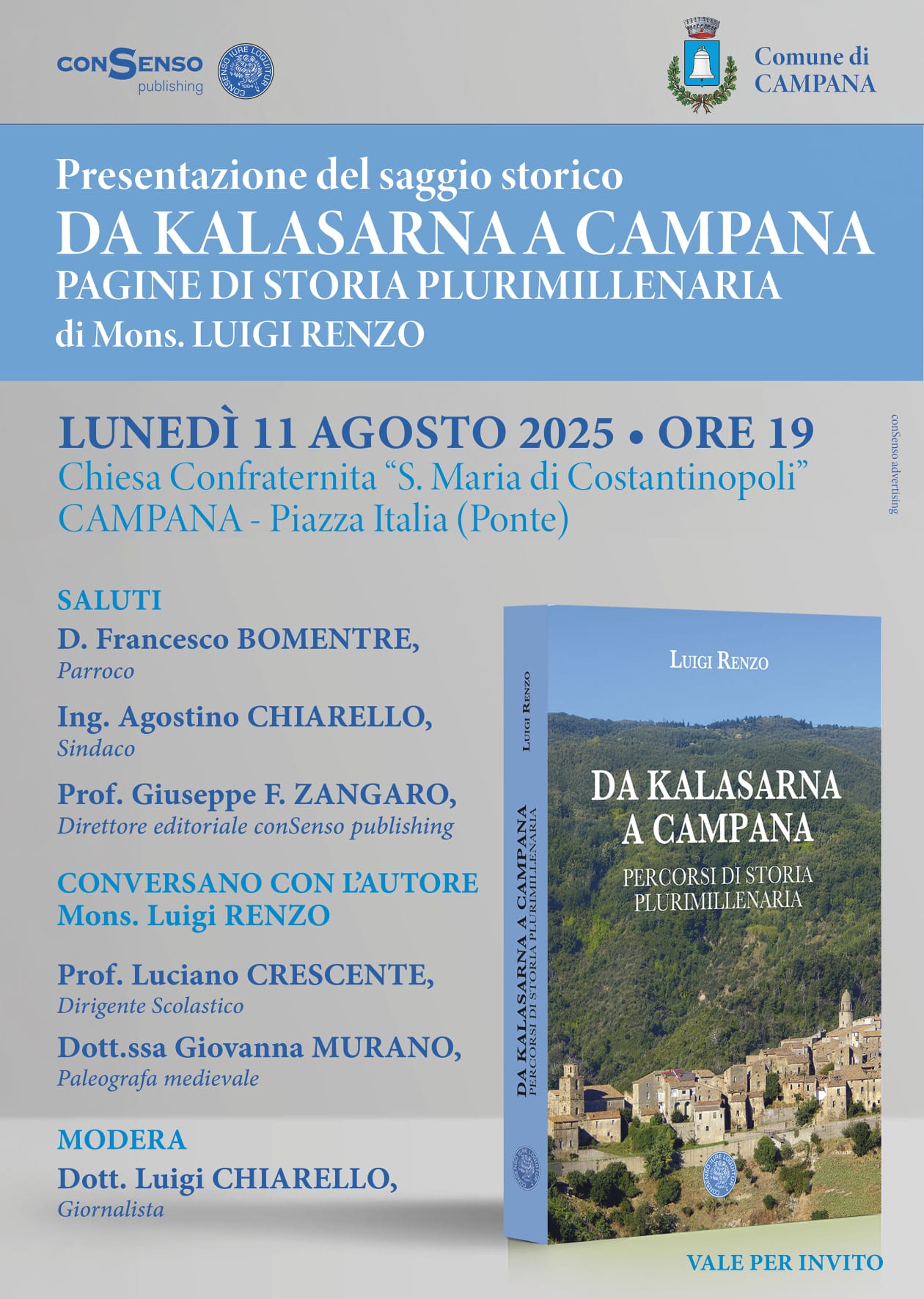 Presentazione del libro “Da Kalasarna a Campana” – Campana 2025 Lunedì 11 agosto 2025 — ore 19:00Chiesa Confraternita “S. Maria di Costantinopoli” – Piazza Italia (Ponte), Campana (CS) Il Comune di Campana e conSenso Publishing presentano il saggio storico “Da Kalasarna a Campana – Pagine di storia plurimillenaria” di Mons. Luigi Renzo.Un appuntamento imperdibile per […]