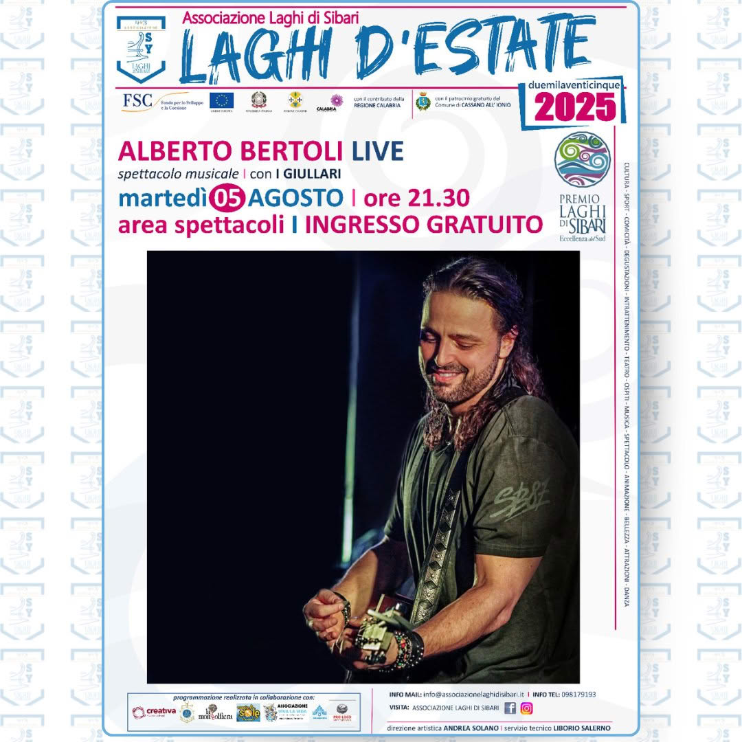ALBERTO BERTOLI LIVESpettacolo musicale con i Giullari Data: Martedì 5 agostoOrario: Ore 21:30Luogo: Laghi di Sibari – Area SpettacoliIngresso: Gratuito fino ad esaurimento posti Una serata all’insegna della musica dal vivo con Alberto Bertoli e i Giullari, in uno scenario suggestivo tra natura e laguna. L’evento si svolgerà presso l’area spettacoli dei Laghi di Sibari, […]