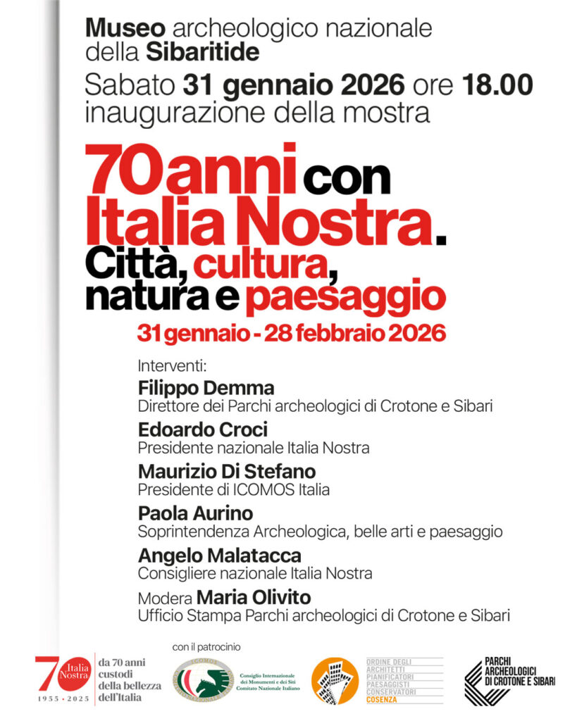 Il Museo archeologico nazionale della Sibaritide ospita, a partire dal 31 gennaio 2026, la mostra “70 anni con Italia Nostra. Città, cultura, natura e paesaggio”, un’esposizione dedicata alla storia e all’impegno di una delle più importanti associazioni italiane per la tutela del patrimonio culturale e ambientale.