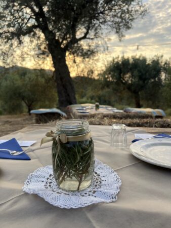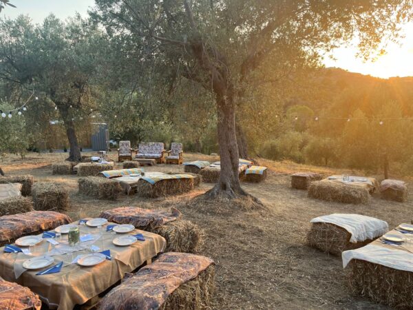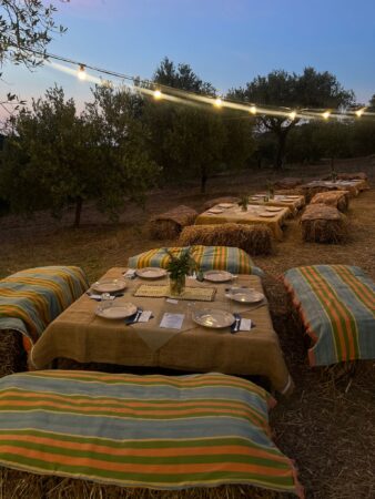 Ogni edizione di AperiOlio è un evento unico che si svolge al tramonto, tra ulivi secolari, balle di fieno, tavoli rustici e luci sospese. Un contesto informale ma raffinato, dove i visitatori sono accolti come amici. I piatti serviti sono vegetariani e leggeri, realizzati con ingredienti locali, accompagnati da cocktail aromatici e oli selezionati.