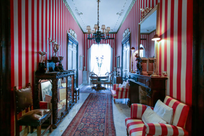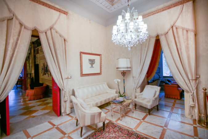 La facciata, sobria ma imponente, introduce a interni ricchi di storia: ampie sale con soffitti a cassettoni, affreschi d’epoca e pavimenti in pietra locale. Ogni dettaglio racconta la raffinatezza di un’epoca in cui eleganza e prestigio erano parte integrante della vita aristocratica.